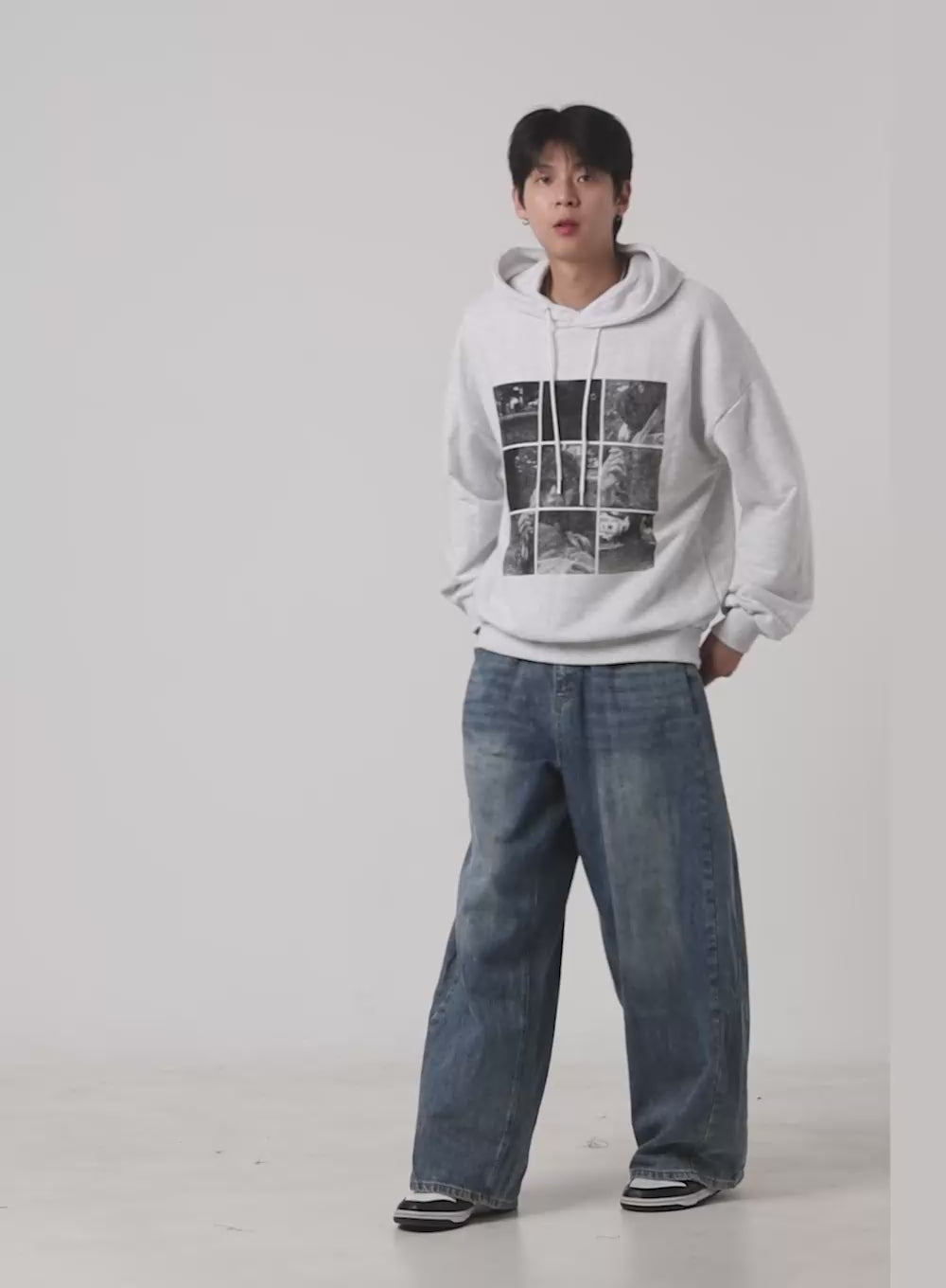 Product Detail Style : Casual Occasion : Back to school Type : Men, Sweat Detail : Hood Print : Graphic Material : Cotton Sleeve : Long sleeve Neck : Hood Fit : Loose fit Cotton100 Color : Light gray, Black Made in Korea Model Size Model is wearing size M/L and the color Light gray….